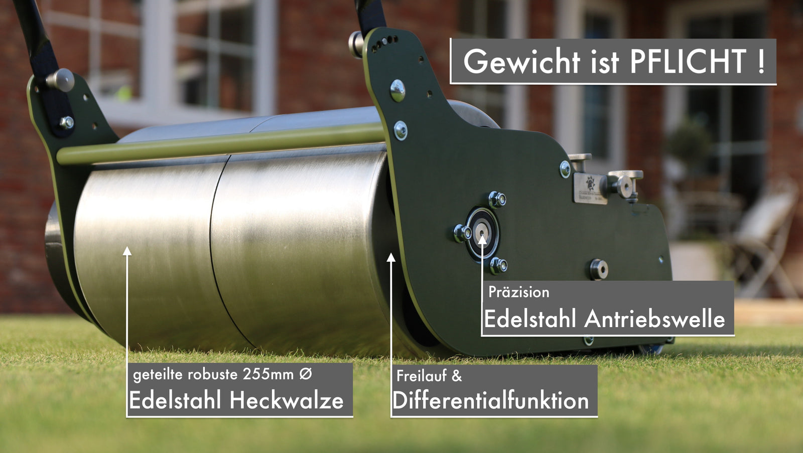 Die geteilte robuste Heckwalze des Falkensteins hat einen Durchmesser von 255 mm und besteht aus Edelstahl. Sie verfügt über eine Freilauf- und Differentialfunktion, die eine reibungslose und präzise Mähleistung ermöglicht. Die Edelstahl-Antriebswelle sorgt für eine zuverlässige Kraftübertragung.