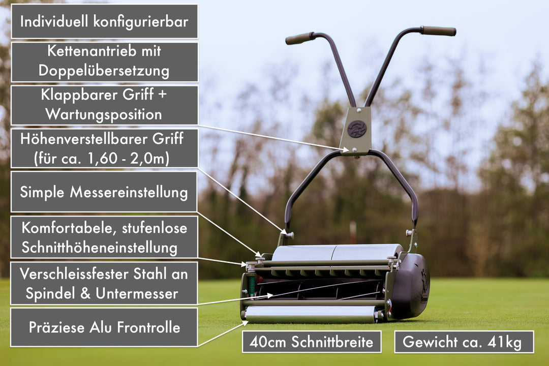 The robust, torsion-resistant design of the Falkenstein ensures a long lifespan. With its stepless, play-free cutting height adjustment, you can set the exact height you want. The balanced weight distribution provides optimal stability and easy handling of the reel mower. A foldable handle allows for space-saving storage, and a maintenance position enables easy servicing and cleaning, as well as manual backlapping.