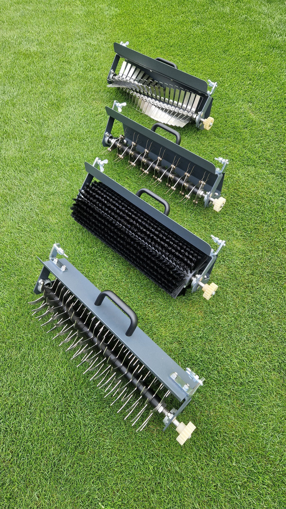 Le peigne éponyme effectue le travail préparatoire. Cette variante est destinée à redresser les brins d'herbe qui se croisent, principalement pourpour améliorer l'optique. Cette étape seuleaméliore les échanges gazeuxet l'apparence, mais nous vous recommandons d'aspirer ensuite la pelouse avec une tondeuse rotative et enfin avec letondeuses à cylindrecouper avec précision. Cela vous permettra d’aérer la pelouse et d’obtenir les meilleurs résultats.