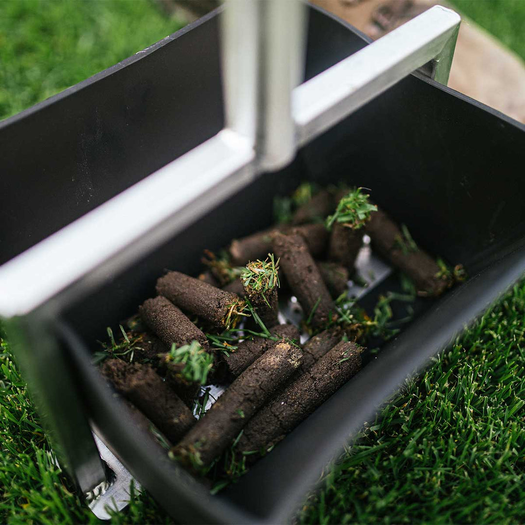 Ein weiterer großer Vorteil des Rasenspechts ist die Auffangwanne. Während bei anderen Aerifizierern der Aushub auf dem Rasen liegen bleibt und mühsam aufgesammelt werden muss, spart dir der Rasenspecht diese Arbeit. Die Erdaushübe fallen direkt in die Auffangschale, sodass du dich nicht mehr mit der Nacharbeit herumschlagen musst.